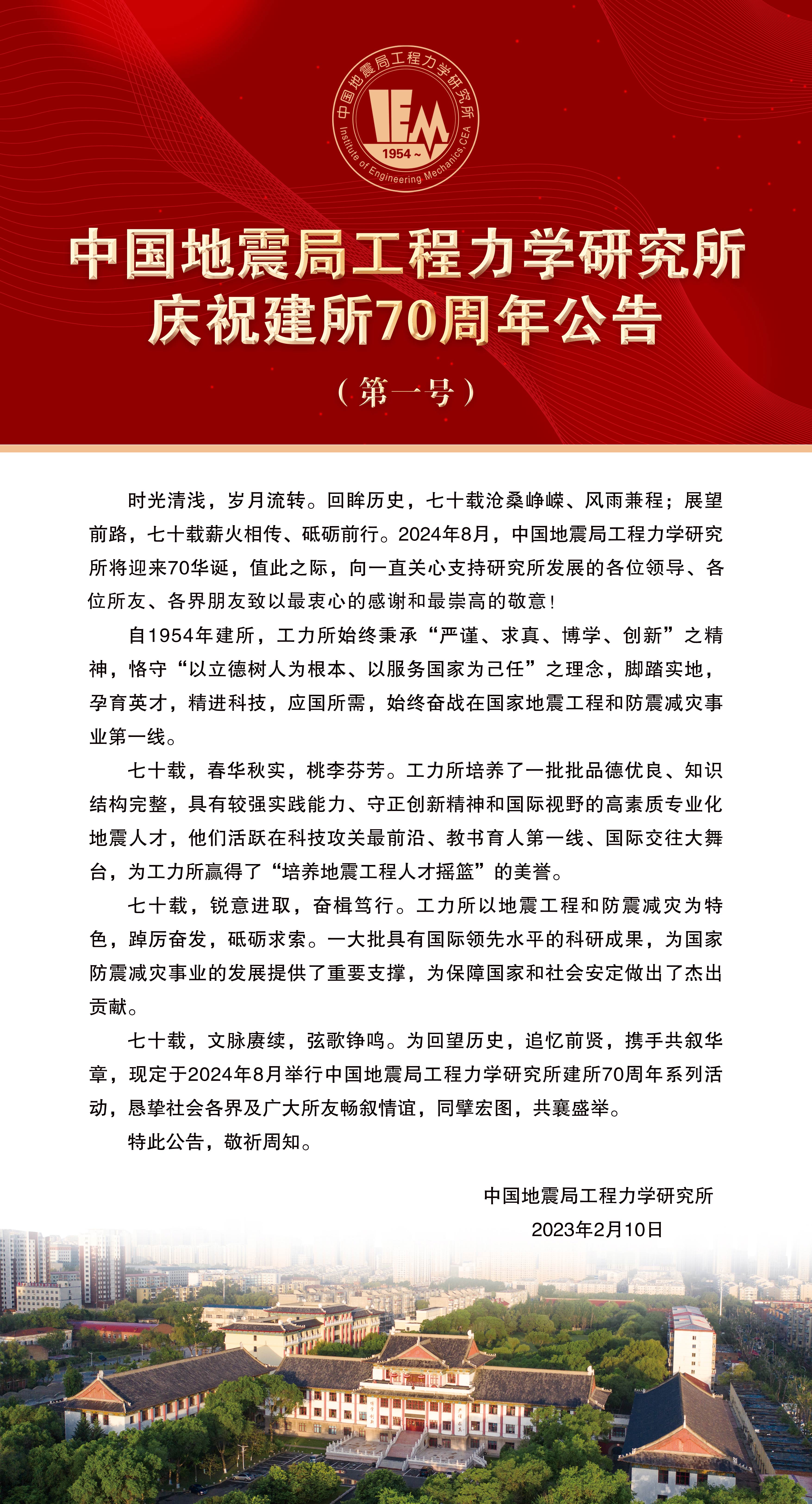 中國(guó)地震局工程力學(xué)研究所慶祝建所70周年公告(第一號(hào))