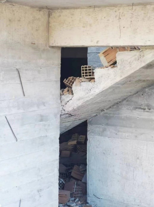 在本次地震現(xiàn)場(chǎng)觀察到的幾棟建筑的樓梯表現(xiàn)都不太理想,發(fā)生了梯段板斷裂、填充墻倒塌堵塞等,如圖1、圖2。其中圖1為新建建筑,可以看到明顯的梯段板斷裂。硬連接樓梯的作用類似斜撐,將受到比設(shè)計(jì)荷載大得多的地震內(nèi)力,因此往往受到嚴(yán)重破壞,這在我國(guó)震害中也較為常見。近年來(lái)我國(guó)抗震規(guī)范對(duì)樓梯問題做了專門規(guī)定,提供了多種解決方案,將有效避免梯段板的破壞。