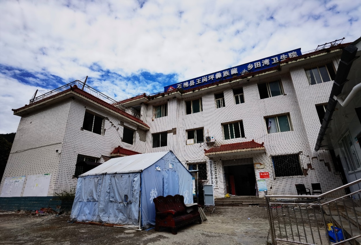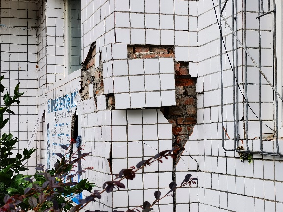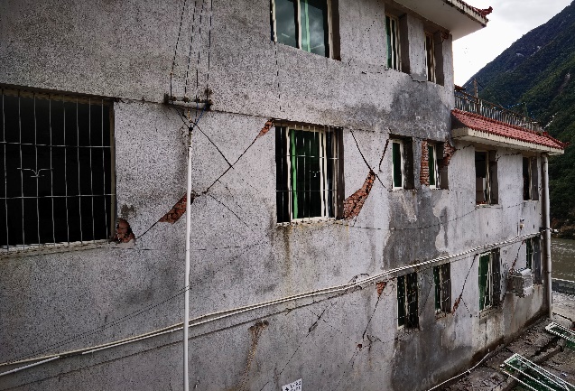 圖4 王崗坪彝族藏族鄉(xiāng)田灣衛(wèi)生院(磚混結(jié)構(gòu)、承重墻開裂歪閃、窗間墻出現(xiàn)明顯X裂縫)