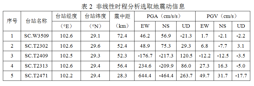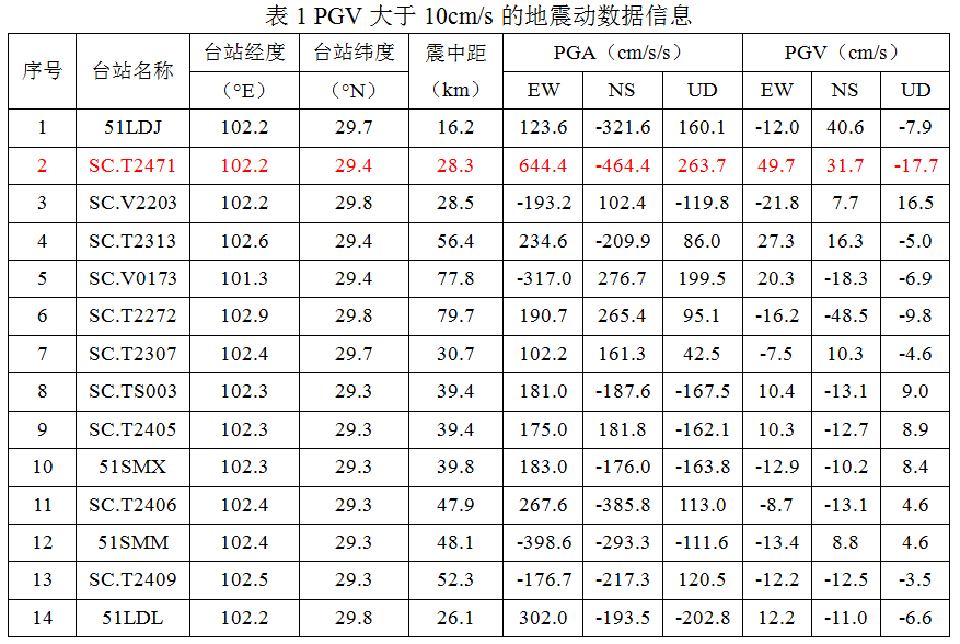 2022年9月5日12時(shí)52分,四川省甘孜州瀘定縣發(fā)生6.8級地震,我所強(qiáng)震動(dòng)觀測中心在震后共收集處理距震中100公里范圍內(nèi)強(qiáng)震動(dòng)記錄110組。其中PGV大于10cm/s的數(shù)據(jù)14組,PGV大于20cm/s的數(shù)據(jù)6組,基本信息見下表1。本次地震的卓越頻率范圍較寬,不同臺站區(qū)別較大,如SC.W3509臺站記錄到的地震動(dòng)卓越頻率在5Hz左右,SC.T2313臺站記錄到的地震動(dòng)卓越頻率在2.5Hz左右,SC.T2302臺站記錄到的地震動(dòng)在1Hz左右有明顯的峰值,且其在0.1-1.2Hz范圍內(nèi)均具有比較豐富的頻率成分。