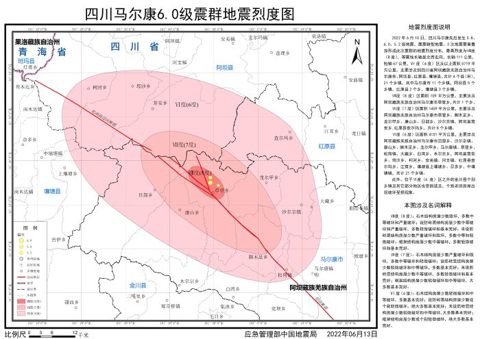 發(fā)布時(shí)間: 2022-06-22 點(diǎn)擊數(shù)量:54712022年6月10日,四川阿壩州馬爾康市先后發(fā)生5.8、6.0、5.2級(jí)地震,屬震群型地震。地震發(fā)生后,按照應(yīng)急管理部部署,中國地震局組織四川省地震局開展應(yīng)急處置工作,依照《地震現(xiàn)場工作 第3部分:調(diào)查規(guī)范》(GB/T 18208.3-2011)、《中國地震烈度表》(GB/T 17742-2020),通過災(zāi)區(qū)震害調(diào)查,并綜合應(yīng)用儀器烈度、地震構(gòu)造背景、余震分布、震源機(jī)制、遙感影像等科技支撐成果,確定了此次地震的烈度分布,并依照《地震烈度圖制圖規(guī)范》(GB/T 38226-2019)編制完成《四川馬爾康6.0級(jí)震群地震烈度圖》。
