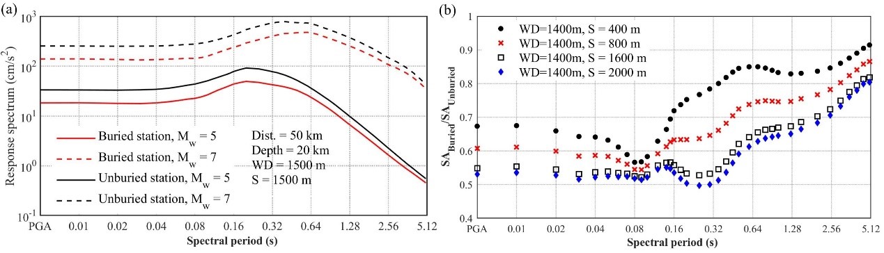 圖4 本研究中海底臺站埋設和未埋設對反應譜值影響對比