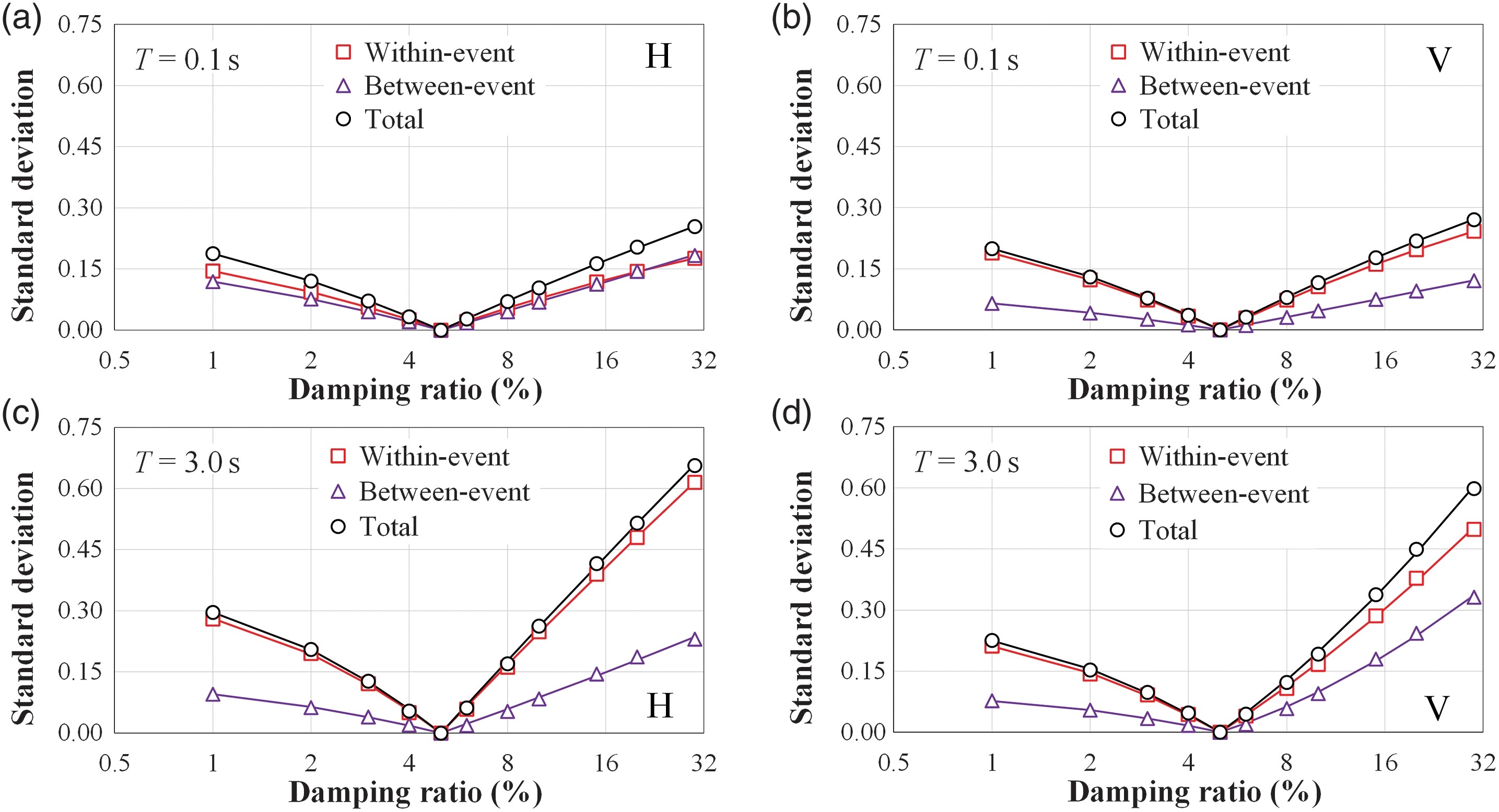 (4)阻尼比為1%時的所有標準差都小于阻尼比為30%時的標準差??倶藴什钆c事件內標準差接近,表明DMF模型的不確定性主要取決于震源效應以外的效應。豎向DMF的標準差略小于水平向DMF的標準差。