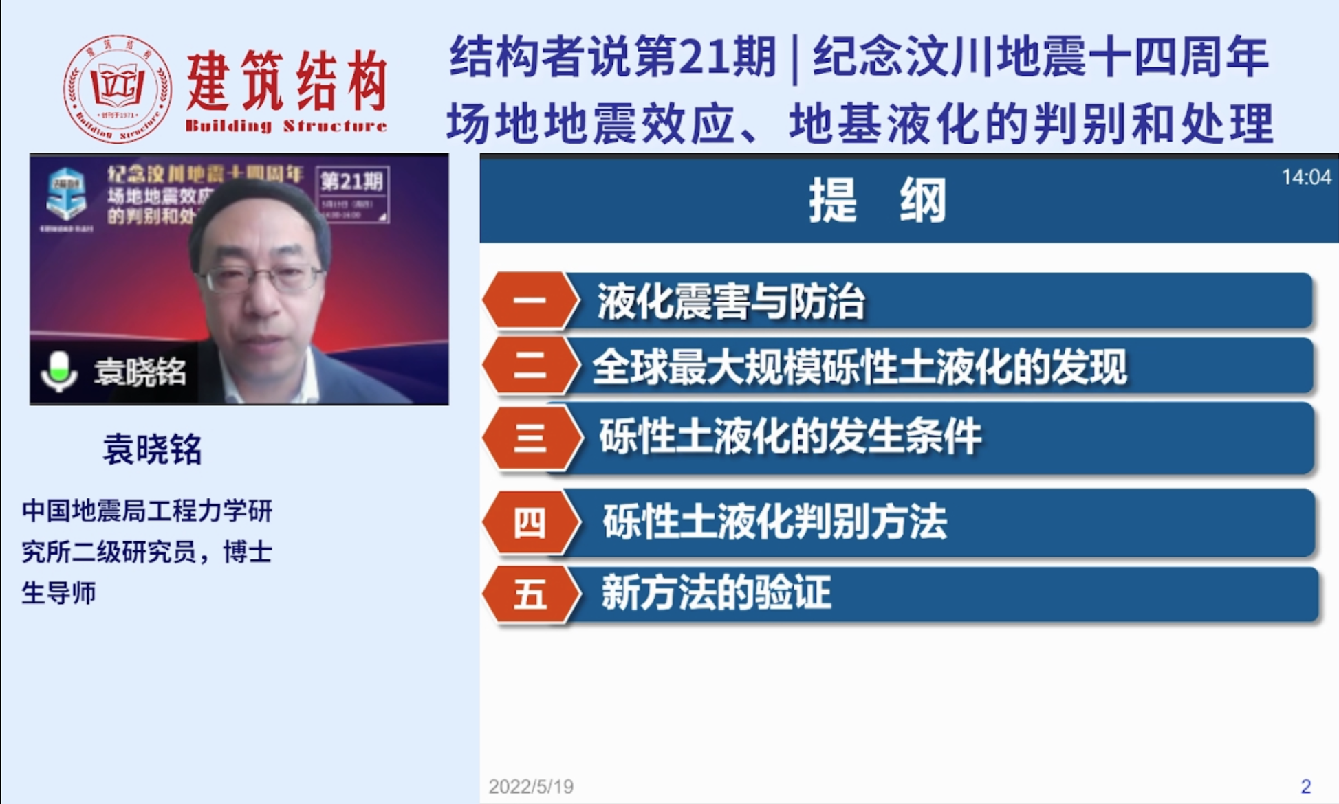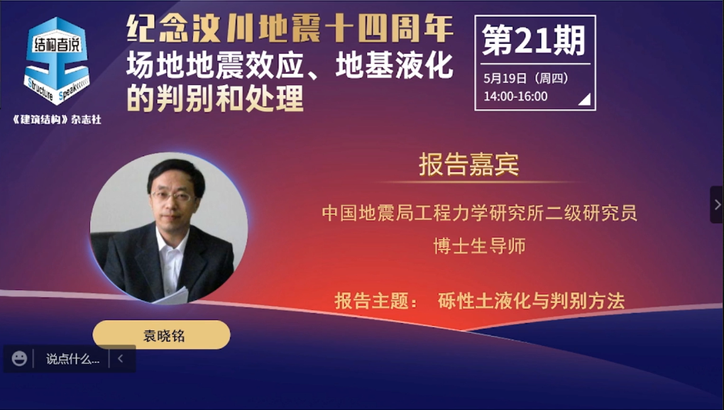 發(fā)布時(shí)間: 2022-05-24 點(diǎn)擊數(shù)量:4101袁曉銘研究員的報(bào)告中,介紹了2008年汶川大地震中發(fā)生的全球最大規(guī)模的礫性土液化及震害現(xiàn)象,解釋了礫性土液化的機(jī)理和觸發(fā)條件;介紹了具有中國特色的礫性土液化判別方法以及通過國際合作對新方法的驗(yàn)證結(jié)果。報(bào)告面向一線工程技術(shù)人員,采用深入淺出的方式進(jìn)行講解,受到工程技術(shù)人員的歡迎。報(bào)告后的互動提問環(huán)節(jié),袁曉銘研究員在線回答了聽眾提出的關(guān)于“學(xué)校和醫(yī)院提高一度進(jìn)行液化設(shè)防的必要性”、“礫性土和砂土液化判別方法的差別”、“不液化和不考慮液化概念的區(qū)別”等一系列問題。